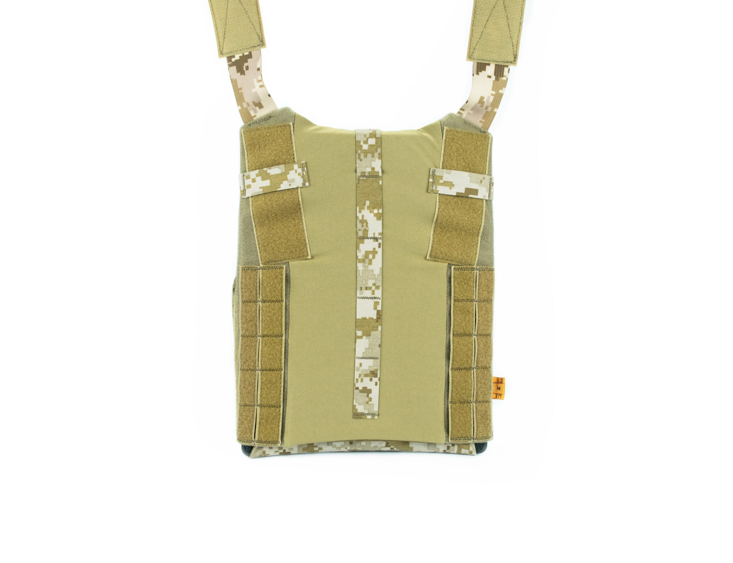 Плитоноска Frankenstein розробленна для використання з Корсетом/Harness від AVS що в поєднанні легкості та корсету розвантажує плечі та рівномірно розподіляє вагу по тілу в даному виробу реалізованні побажання користувачів,в серединні чохлів розташоване велкро для кріплення кліматичних подушок що покращує комфорт при користуванні,по всій довжині клапану додано велкро що надійно фіксує плиту та унеможливлює її випадання.