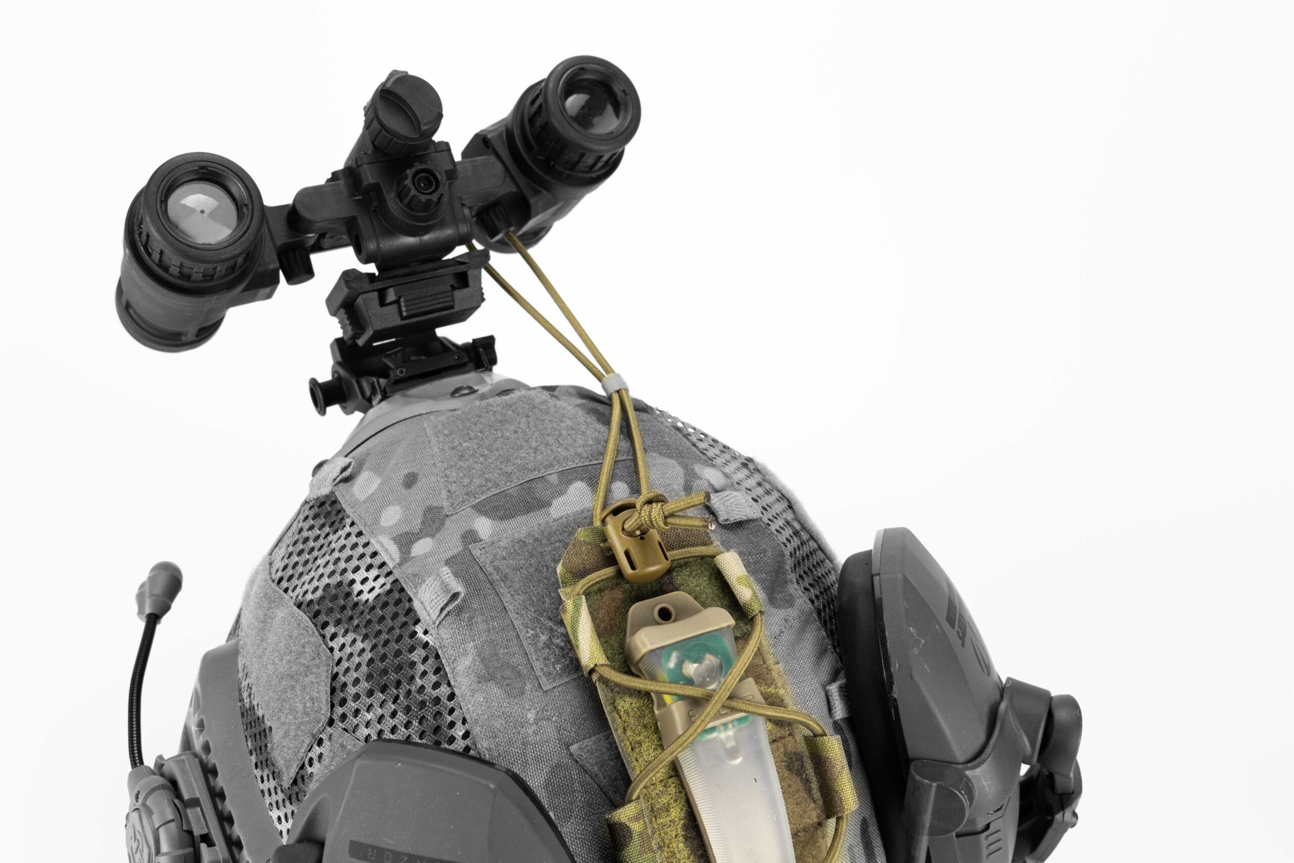 Противага на шолом розроблена для вирівнювання балансу шолома при носінні ПНБ, тепловізору або зберігання батареї для для них. Має страхувальні отвори для фіксації ПНБ або тепловізору, додатково кріпиться на бокові гвинти від рейок шолому. В середині підсумку зробені чарунки під батарейки або противаги, бокова еластична стрічка для фіксування дротів від навушників. По всій довжині розташоване велкро для кріплення додаткового спорядження.